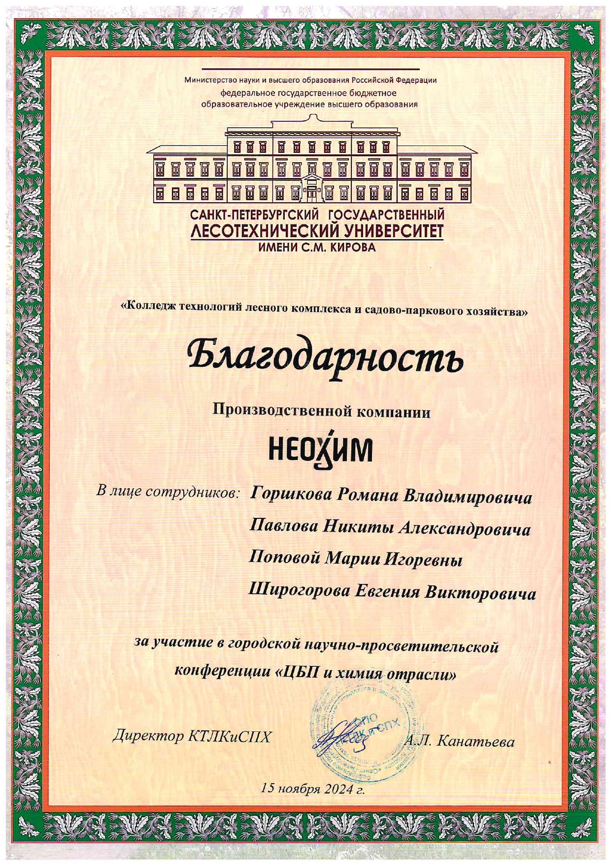 Благодарность Санкт-Петербургского государственного лесотехнического университета